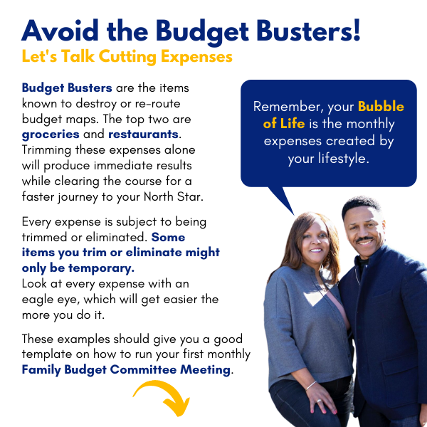 This is one of the items that is considered a “budget buster” meaning that this is where most people deviate from their maps. This expenditure can be trimmed 99% of the time. Find a number that everyone can live with and stick to it.